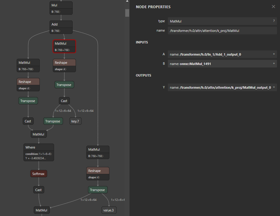 특정 ONNX Optimizer의 pass 이름을 알고 있다면, Simplifier에서 특정 최적화는 실행하지 않게 할 수 있을 것 같습니다. 한 가지 팁을 드리자면, ONNX Optimizer의 pass 파일의 확장자를 뺀 문자열이 최적화 이름과 동일하게 됩니다. 예를 들어, identity 노드를 제거하기 싫다면 eliminate_identity.h에서 확장자를 뺀 eliminate_identity를 skipped_optimizers로 전달하면 됩니다. 제 경우, qkv의 fusion을 비활성화하고 싶으므로 skipped_optimizers=["fuse_qkv"] 를 넘겨주었습니다. 실제로 해당 결과를 살펴보겠습니다