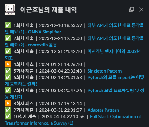 Slack 요금제의 한계로 자기소개를 지금은 확인할 수 없으나, 내 기억이 맞으면 Quantization 도메인에 대한 글을 많이 작성하고 싶다고 했던 것으로 기억한다. 총 9회 제출 중 Quantization과 직접적인 관련이 있는 글은 제일 마지막에 제출한 서베이 논문의 일부를 커버한 내용뿐이라 콘텐츠의 구성에 있어서 조금 아쉬운 느낌이 든다. 향후 계획에도 작성해 뒀지만, 이후 글 작성에는 좀 더 Quantization과 관련된 글들을 많이 작성하려고 한다.