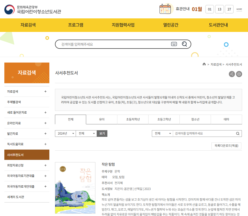 국립중앙도서관과 비슷하게 국립어린이청소년도서관에서는 유아부터 시작해 초등학생, 그리고 청소년을 위한 추천 도서를 정리해서 공개하고 있다. 문화체육관광부 국립어린이청소년도서관 홈페이지 또는 다음 링크를 통해서 나이별로 그리고 주제별로 추천 도서를 아래 그림처럼 확인할 수 있다. 25년 1월 말 기준으로 총 2,440개의 추천 도서가 존재한다. 간단한 책 소개도 같이 수록되어 있으니, 구매나 도서 대출 전 자녀와 함께 읽어보고 흥미에 맞는 책을 고르는 데 한결 도움이 되지 않을까 싶다.