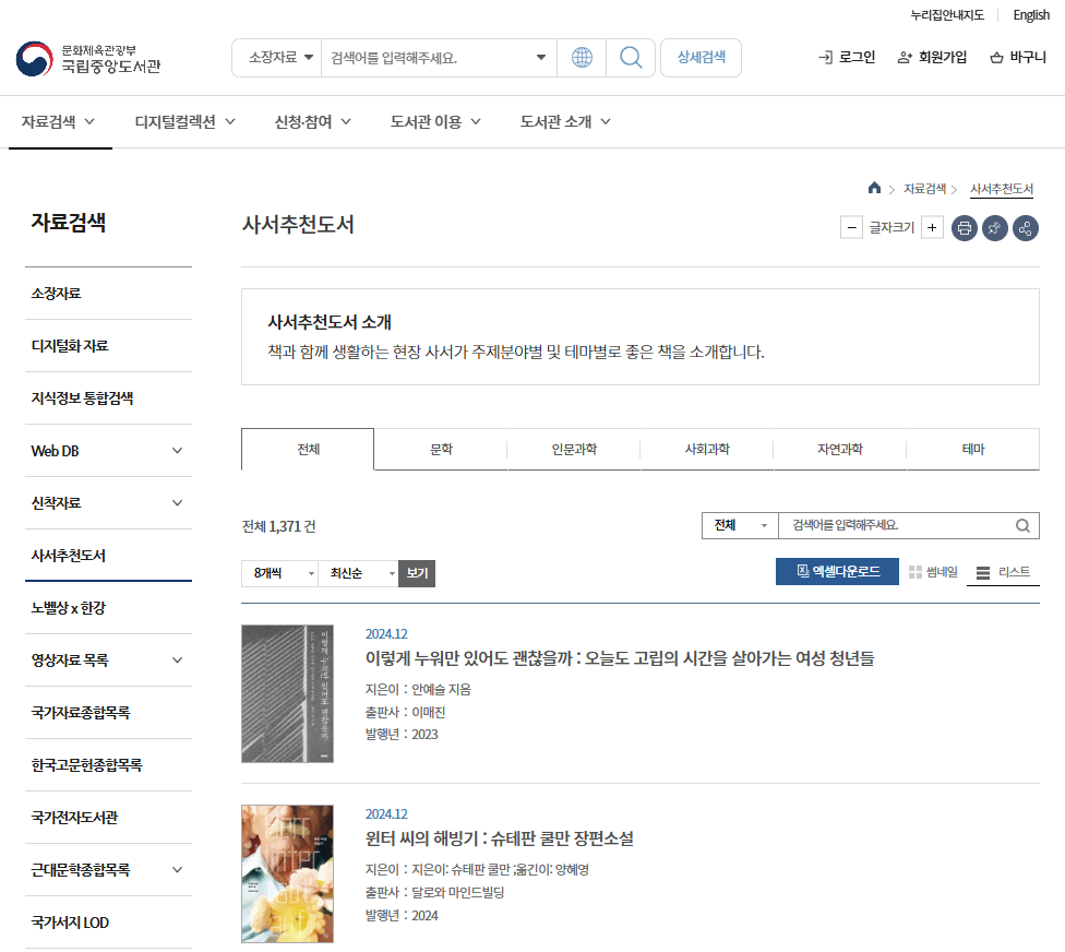 문화체육관광부 국립중앙도서관 홈페이지 또는 다음 링크를 통해서 여러 주제 (문학, 인문과학, 사회과학, 자연과학) 및 테마별로 정리한 추천 도서를 찾아볼 수 있다. 등록순으로 결과를 정렬해서 봤을 때 대략 2009년 혹은 2010년부터 목록을 만들기 시작한 것 같으며, 25년 1월 말 기준으로 총 1,371개의 추천 도서가 존재한다. 모든 목록을 확인한 것은 아니지만 대체로 성인을 위한 책들이라고 생각된다.